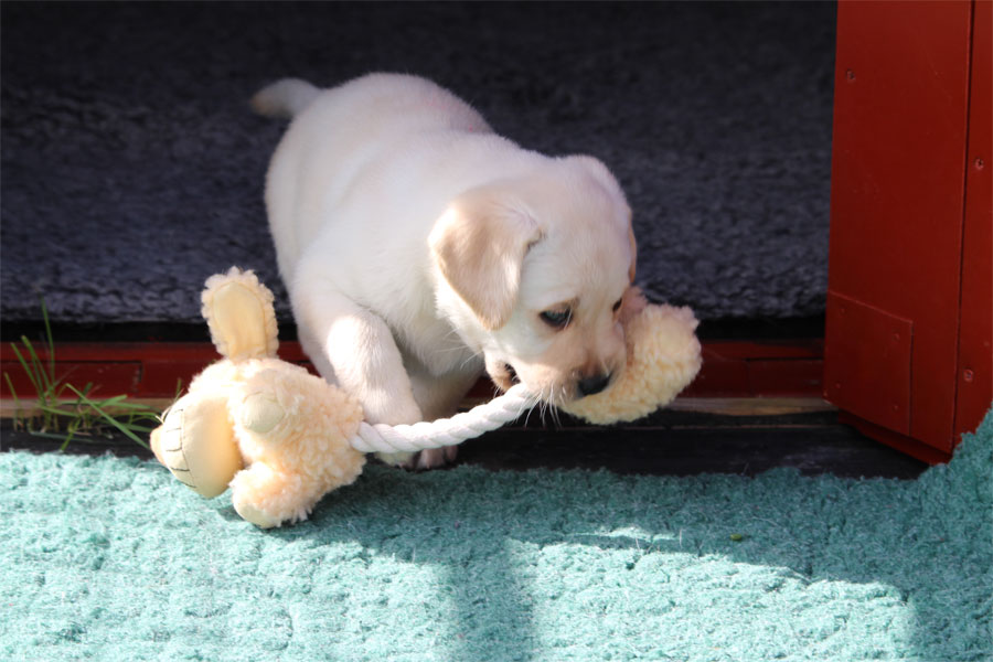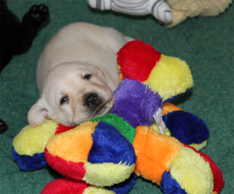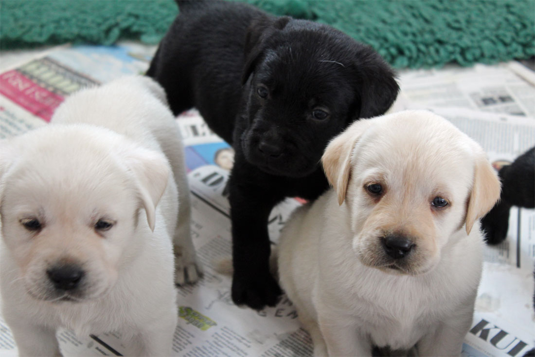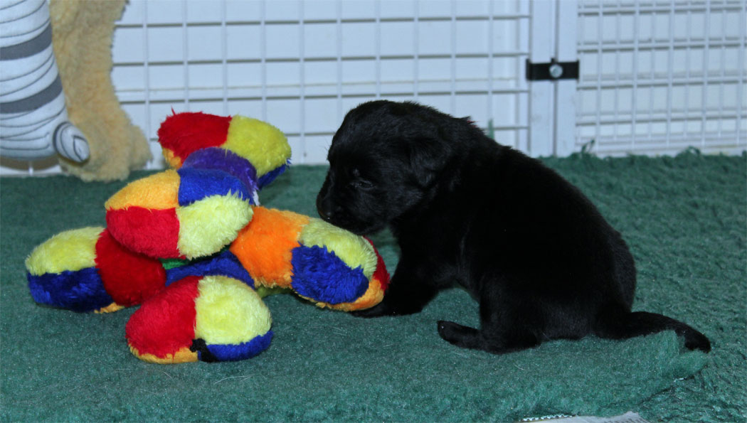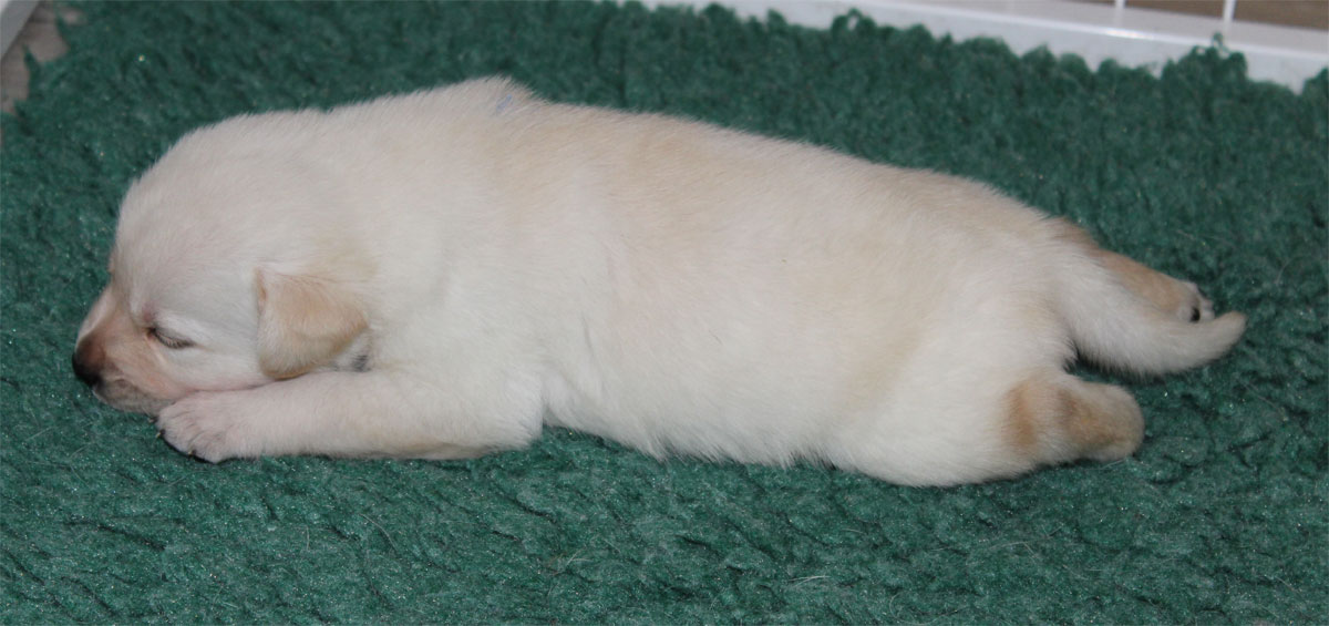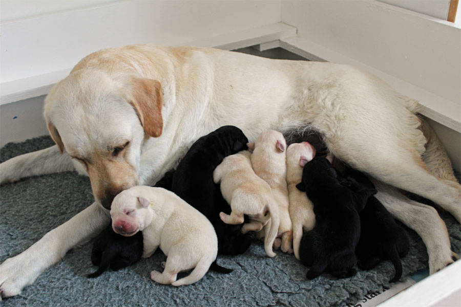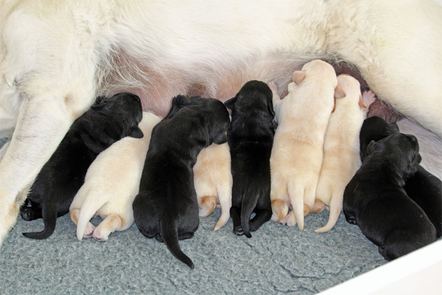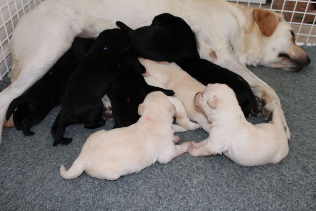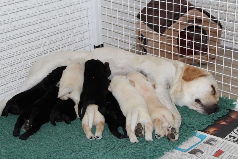 17-07-25 Nio valpar födda: två gula pojkar, två svarta pojkar, två gula flickor och tre svarta flickor.