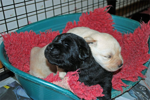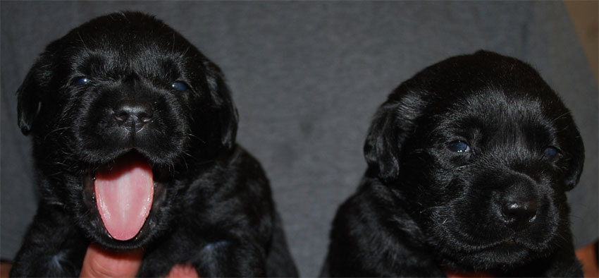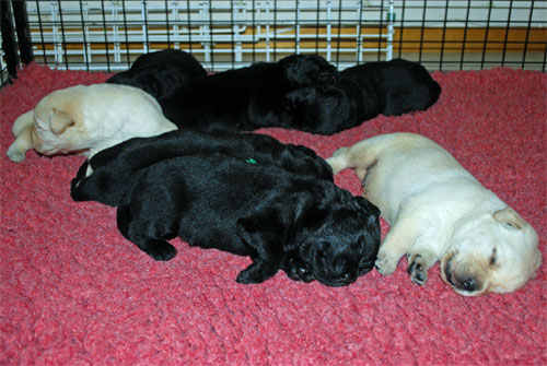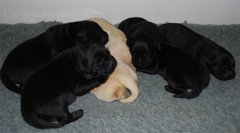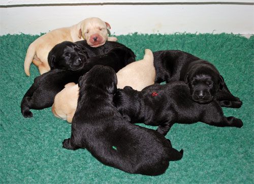 Sju valpar födda 130610. Tre pojkar (en gul och två svarta) och fyra flickor (en gul och tre svarta). Se bilder nedan.