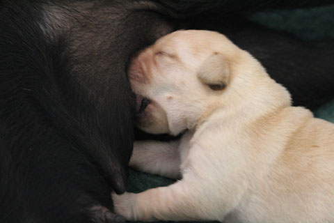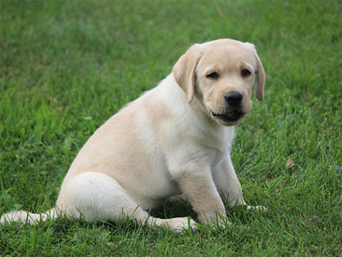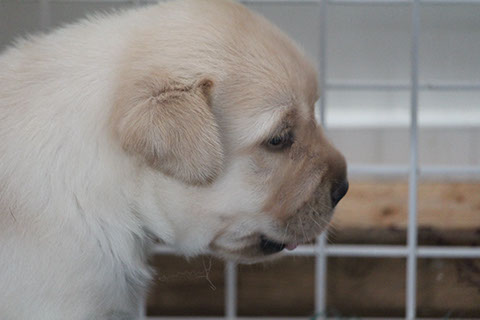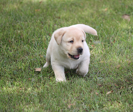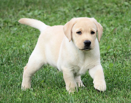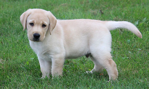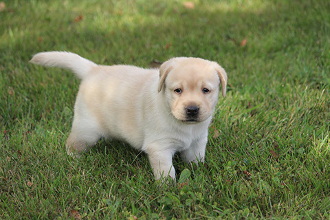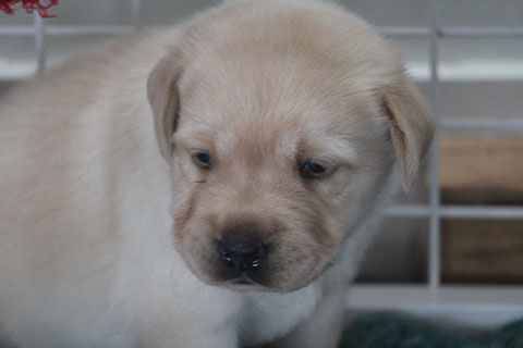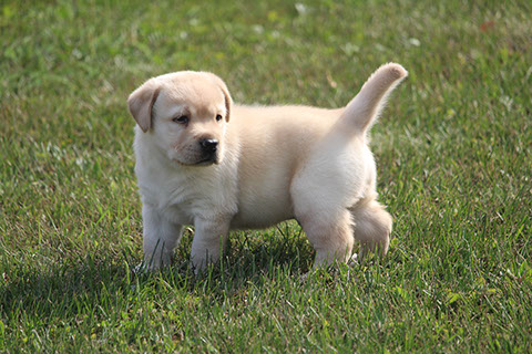 En gul hanvalp född 2018-07-13. Valpen är tingad.